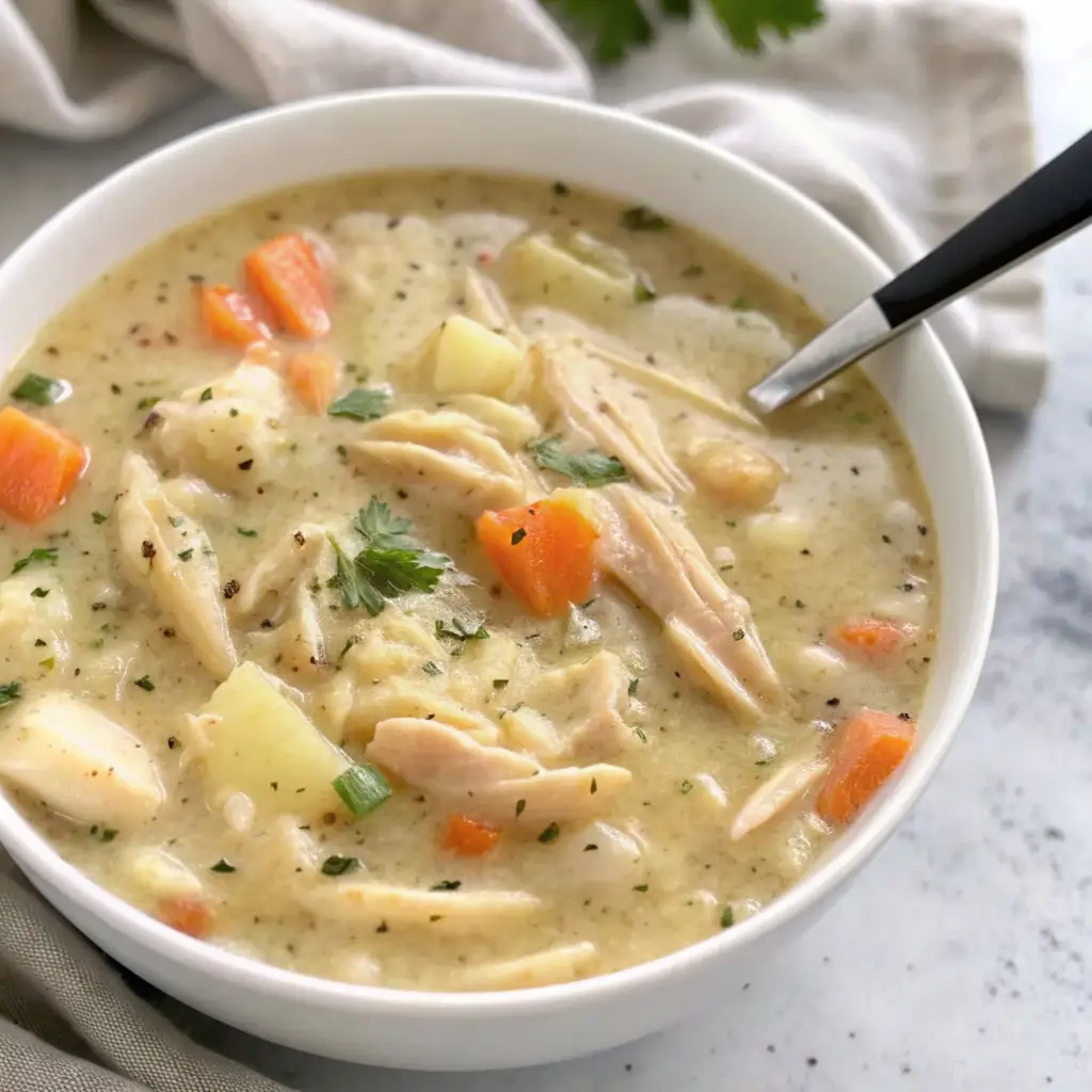 All the nostalgic, comforting flavors of a classic chicken pot pie—tender chicken, peas, carrots, and celery—are here, but transformed into a creamy soup base without the heavy crust.