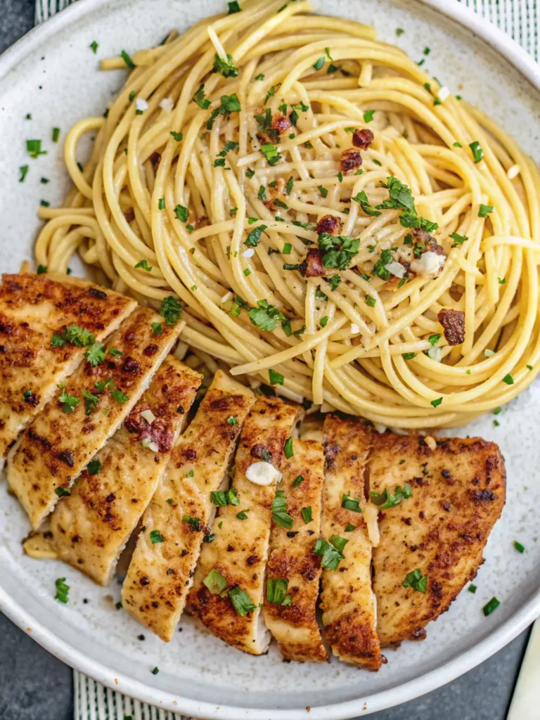 - Slice the chicken and serve it over the garlic butter pasta. Garnish with fresh parsley and extra Parmesan cheese if desired.