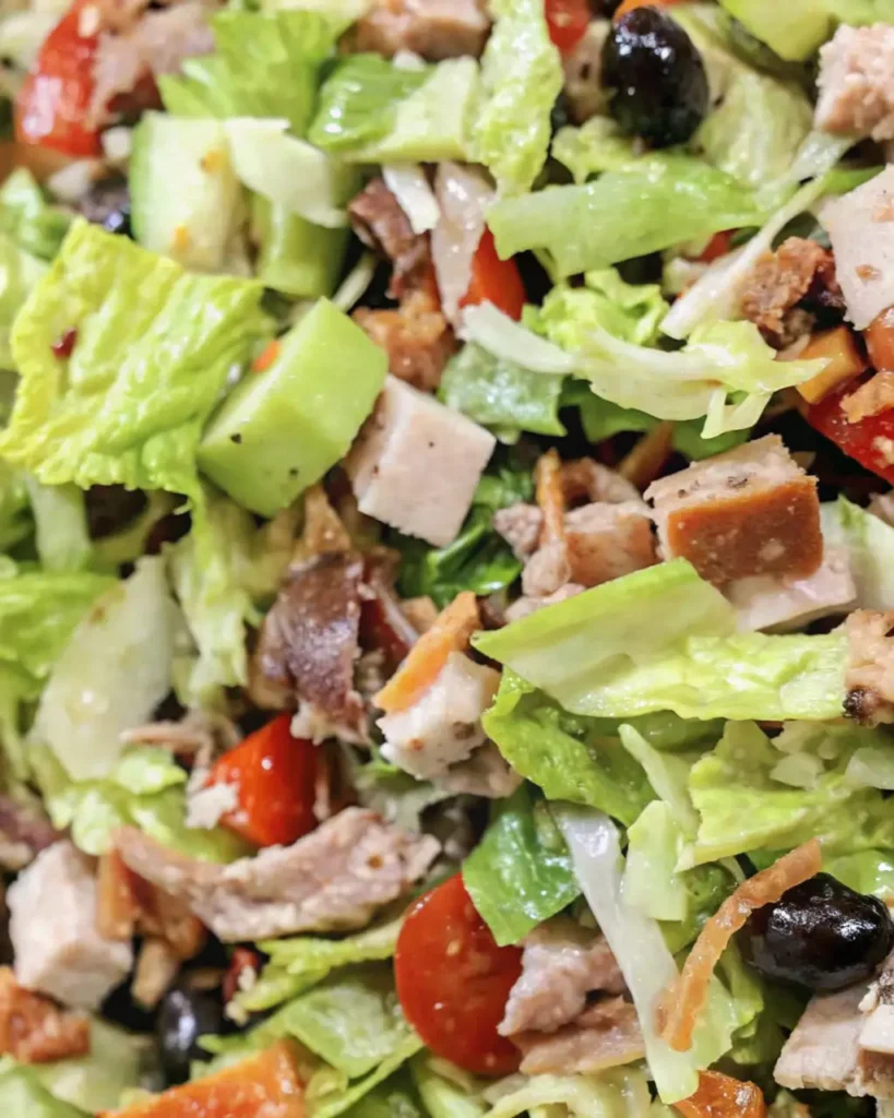 Step 5: The Build. Add the tomatoes, cucumbers, olives, onions, and pepperoncinis. Add the remaining dressing and toss again.
