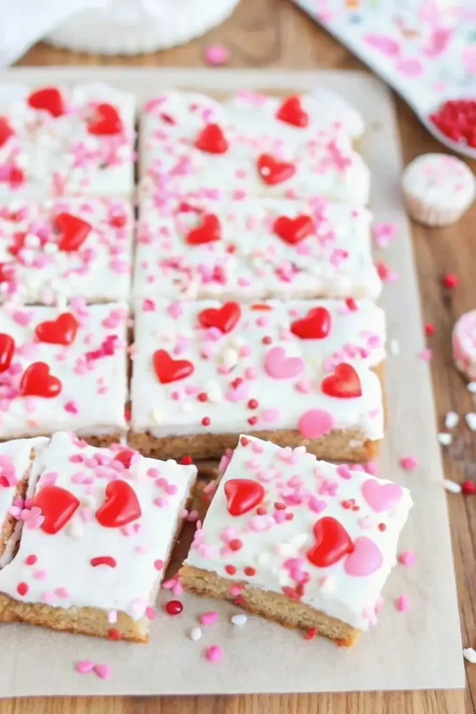 Can I make these as no chill cookie bars? Yes! One of the best features of this recipe is that there’s no chilling required. Unlike traditional rolled sugar cookies, these valentine bar cookies go straight from mixing bowl to oven, making them a time-saving option for busy bakers.