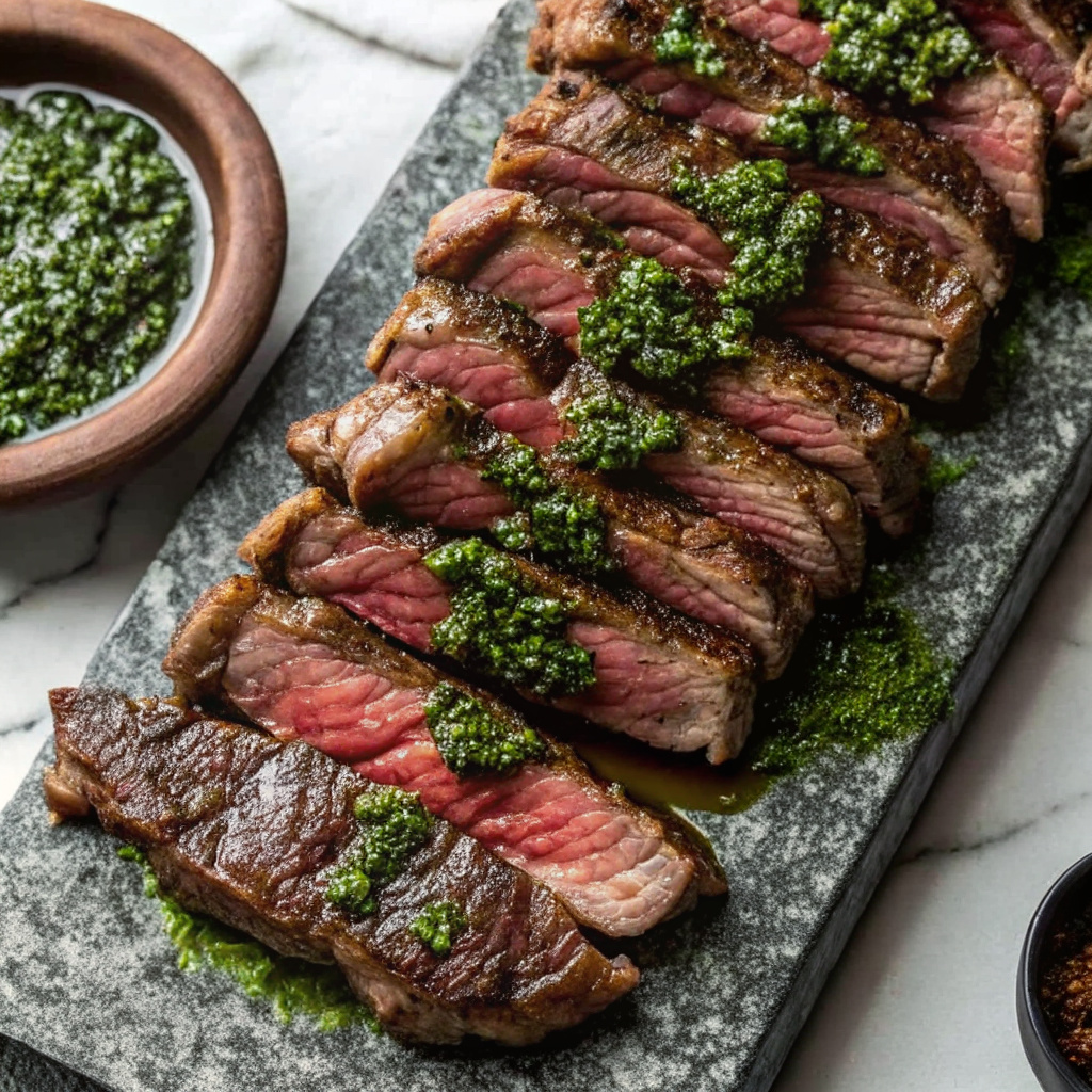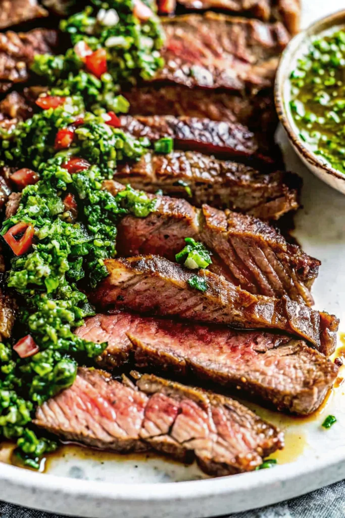 - The Assembly: Arrange the steak slices on a platter and spoon the vibrant chimichurri generously over the top.