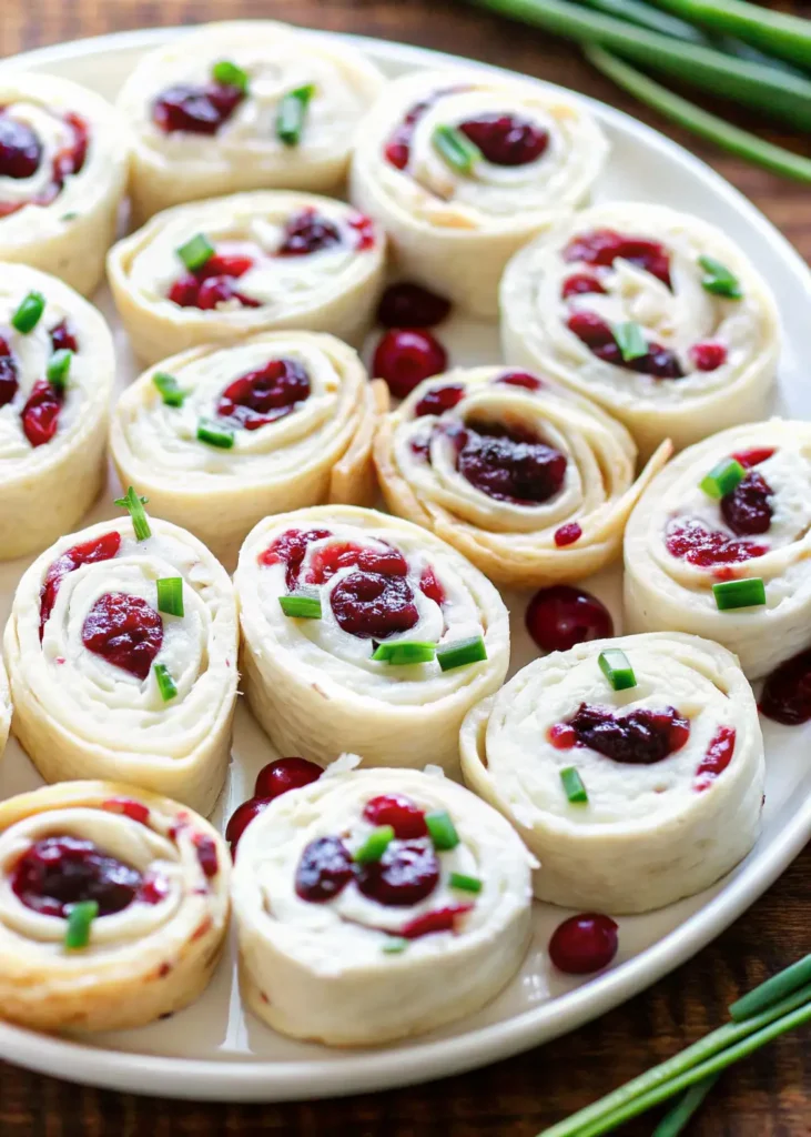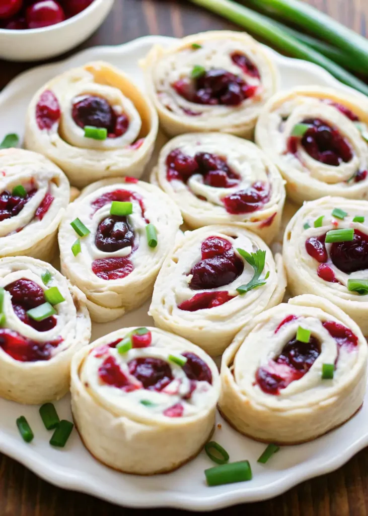 Complete Party Spread: Arrange the cranberry roll ups on a platter alongside crackers, olives, nuts, and fresh fruit for a beautiful and complete appetizer table.