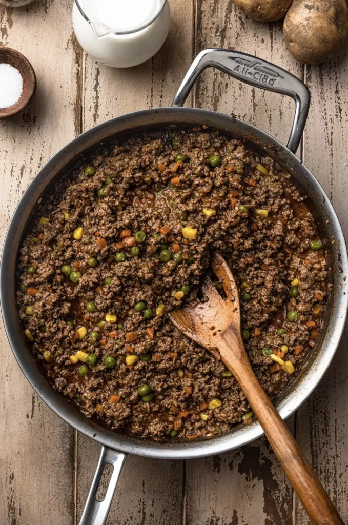 Preheat your oven to 400°F (200°C). Transfer the meat mixture to a 9×13-inch baking dish. Spread the mashed potatoes evenly over the top. Use a fork to create ridges in the potatoes—these will become crispy and golden in the oven!