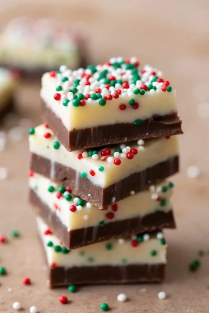 This easy Christmas fudge recipe is the perfect no-bake holiday treat that comes together in just 5 minutes of prep time. Featuring two stunning layers of creamy white chocolate and rich semi-sweet chocolate, this festive fudge is topped with colorful sprinkles for a beautiful presentation. Whether you’re making homemade gifts or filling up your holiday cookie tray, this simple fudge recipe will quickly become a seasonal favorite.