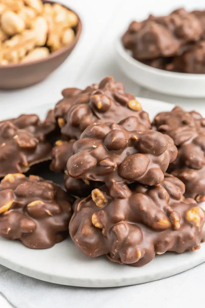 This easy crockpot candy recipe requires just 3 simple ingredients and 5 minutes of prep time! Chocolate peanut clusters made in the slow cooker with salted peanuts, almond bark, and chocolate chips create the perfect sweet and salty holiday treat. No stove watching required—just add ingredients to the crockpot, stir occasionally, scoop, and let set. Perfect for Christmas gift giving, holiday parties, or satisfying your chocolate cravings.