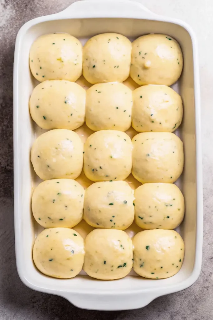 - Arrange in Pan: Lightly butter the bottom and sides of a 9×13 inch baking pan. Place the shaped dough balls in the pan.