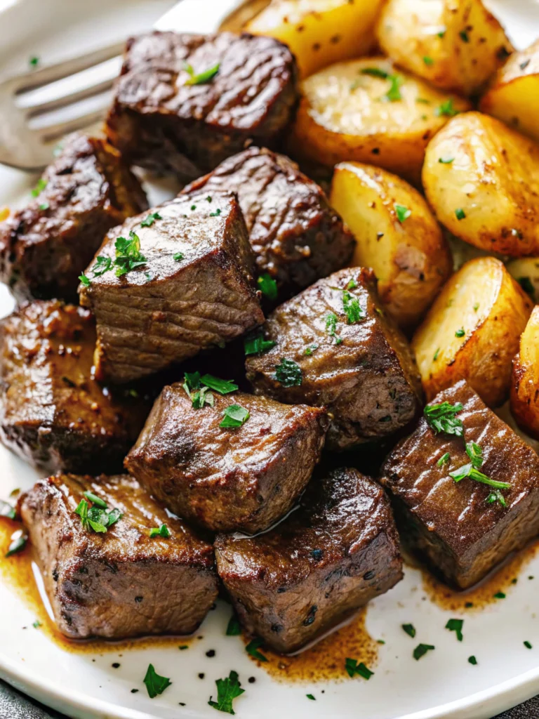 - Return potatoes to the pan and toss with the steak and garlic butter for 1–2 minutes.