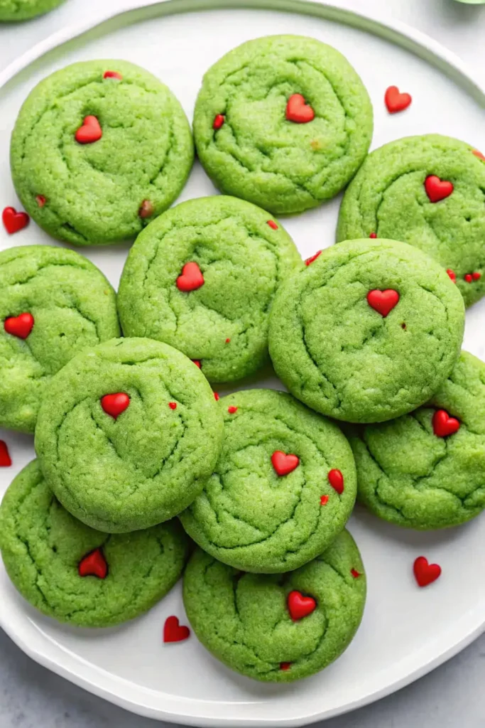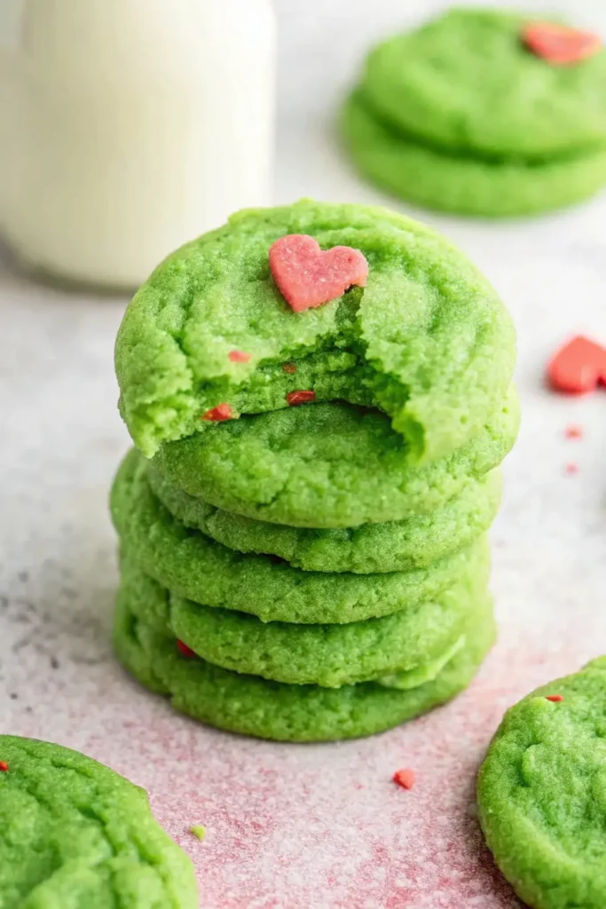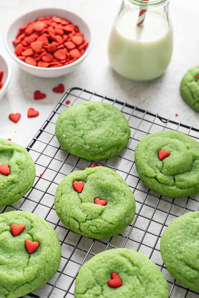 These Grinch sugar cookies are guaranteed to be a hit at any Christmas gathering! With their bright green color, soft chewy texture, and adorable red hearts, they’re as fun to make as they are to eat!