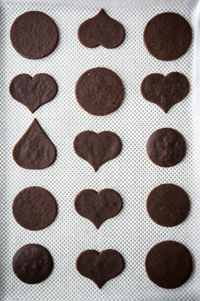 - Preheat oven to 350°F (175°C). Line baking sheets with parchment. Sift flour, cocoa powder, salt, and baking powder in a bowl.
