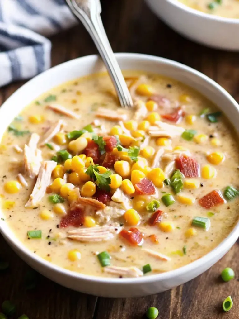 - Finish Chowder: Stir in the corn kernels, shredded chicken, and heavy cream. Let the chowder simmer for another 5 minutes until heated through.