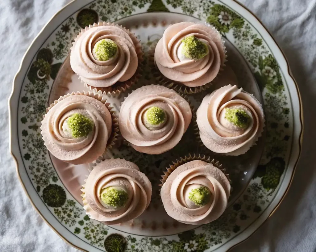 Pipe the rose buttercream onto the cooled pistachio cupcakes. Sprinkle with extra crushed pistachios and a few dried culinary rose petals for an authentic, elegant finish.