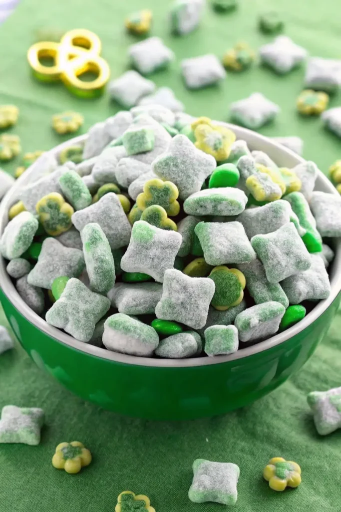 A themed version of “Muddy Buddies.” This cereal-based snack is coated in white chocolate and tossed with green powdered sugar and festive candies.