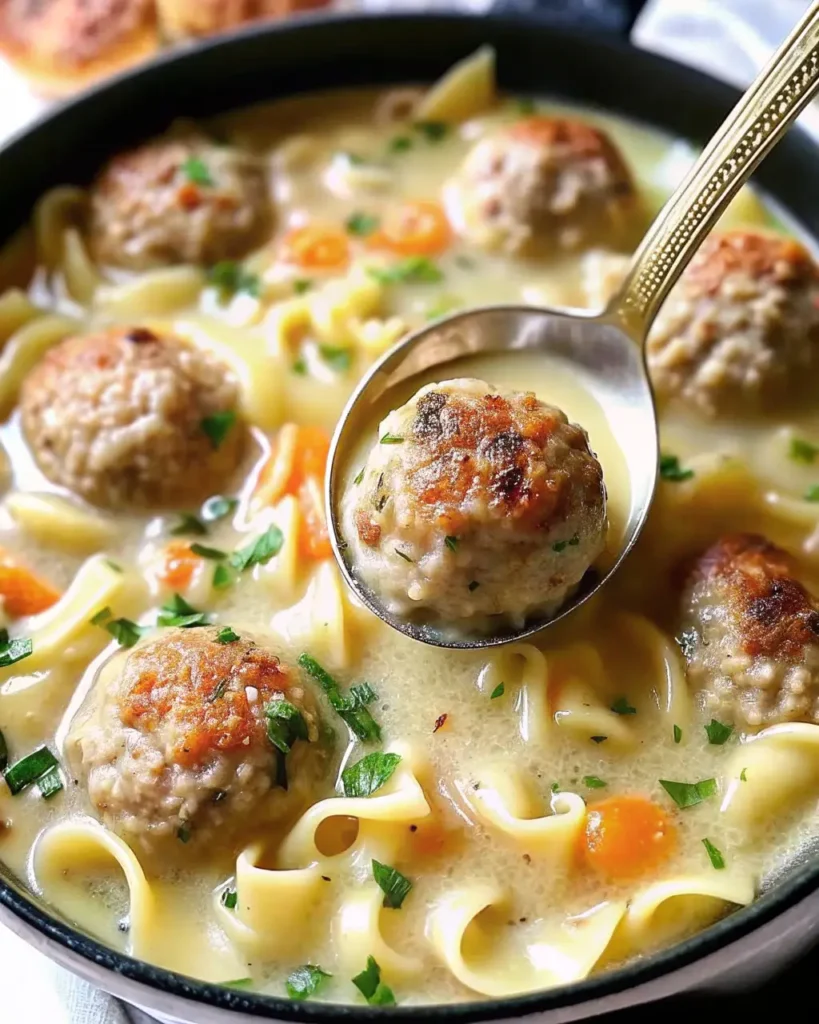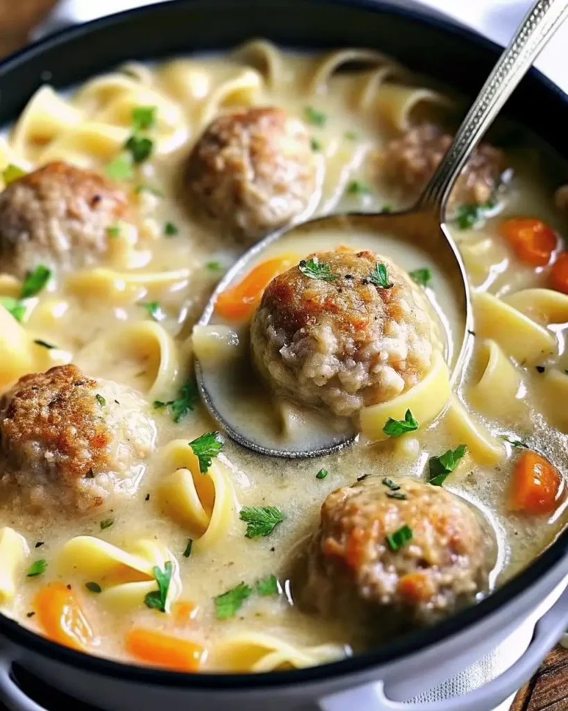 - Add browned meatballs and egg noodles to the simmering soup. Reduce heat and cook 10–12 minutes, until noodles are tender and meatballs reach 160°F internally.