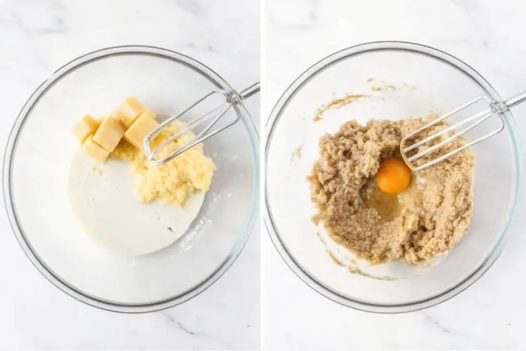 - Make the cookie dough by creaming softened butter, brown sugar, and 1/2 cup granulated sugar until smooth. Mix in one egg and vanilla.