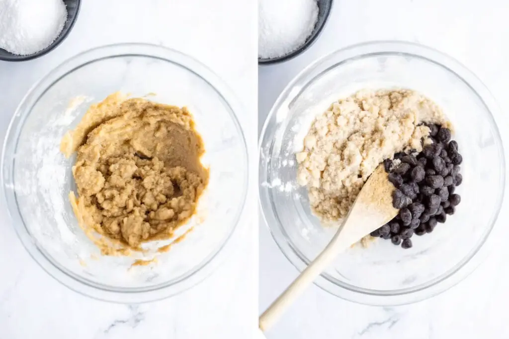 - Stir in flour, baking soda, sea salt, and chocolate chips to form a thick cookie dough.